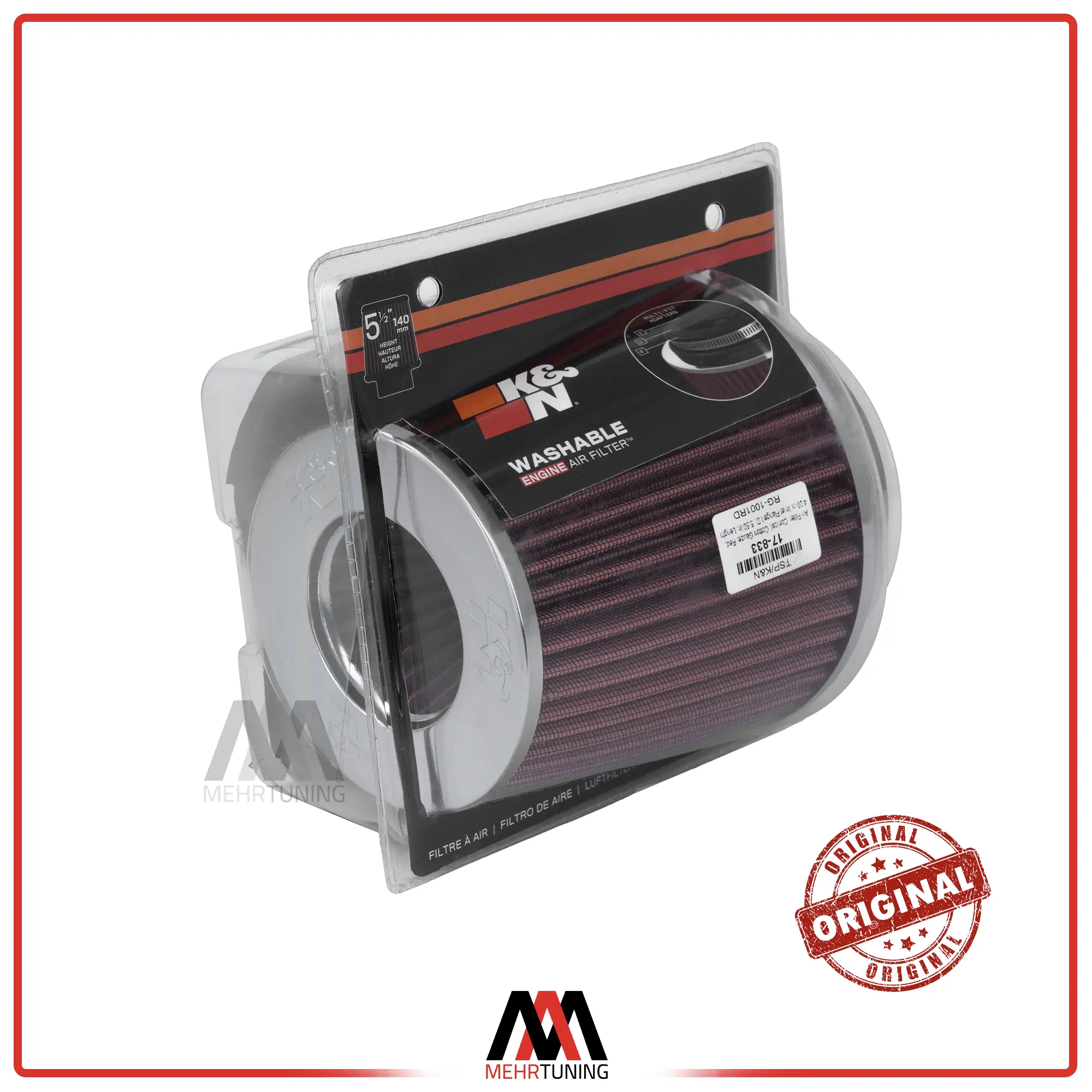 فیلتر هوا k&n اورجینال با آداپتور نصب یکی از فیلتر هوای اسپرت پرکاربرد است که به جهت بهبود عملکرد موتور خودرو طراحی شده است. همانطور که از نام این فیلتر پیداست، اندازه دهانه آن قابلیت تغییر داشته و بدین ترتیب میتوان میزان هوای ورودی به موتور را در آن تنظیم نمود. این قطعه در دستهبندی سیستم هوادهی خودرو قرار داشته و میتواند از ورود گرد و غبار و آلایندهها به موتور جلوگیری کند. اگرچه در مقایسه با سایر فیلترهای هوا از قیمت بالاتری برخوردار است. همچنین لازم است تا در فواصل مشخص برای حفظ عملکرد بهینه خود مورد شستشو قرار گیرد.